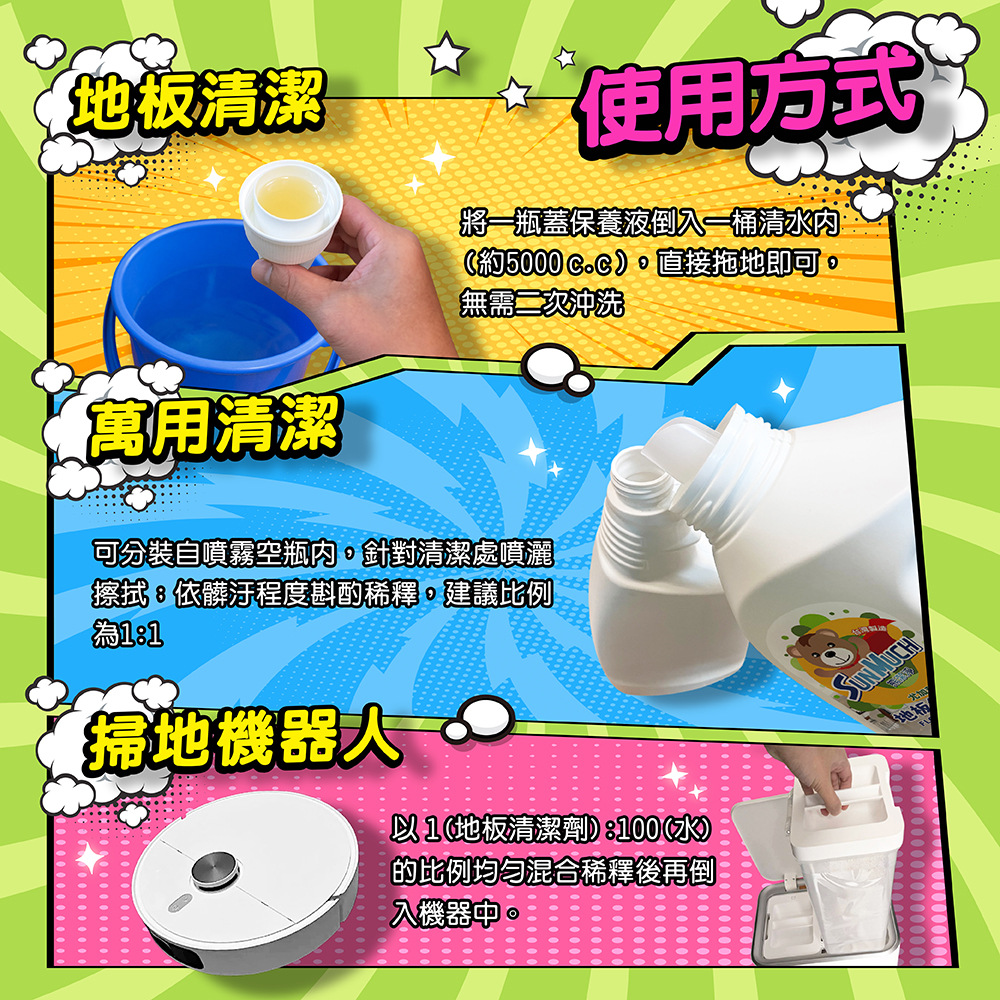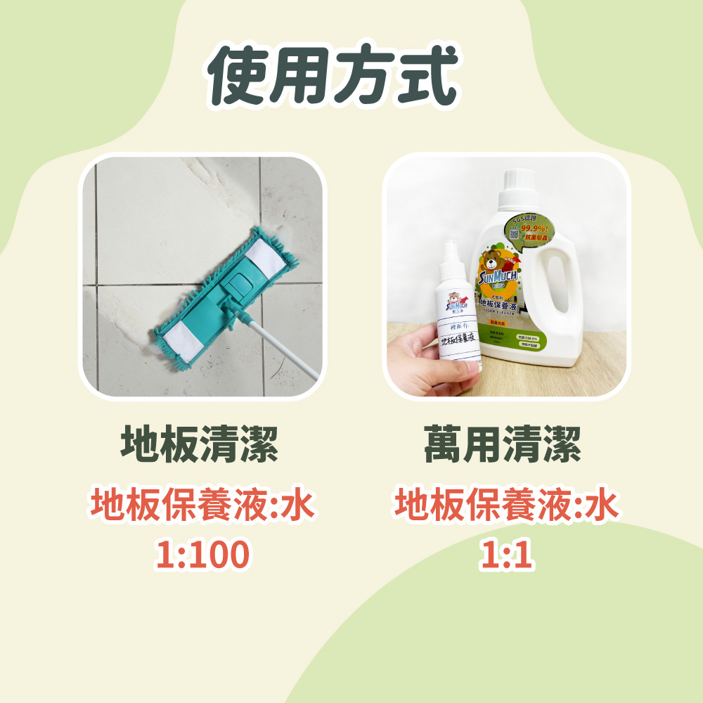 將一瓶蓋保養液倒入半桶清水內(約5000 c.c),直接拖地即可,不必再沖洗,地板快速回乾。