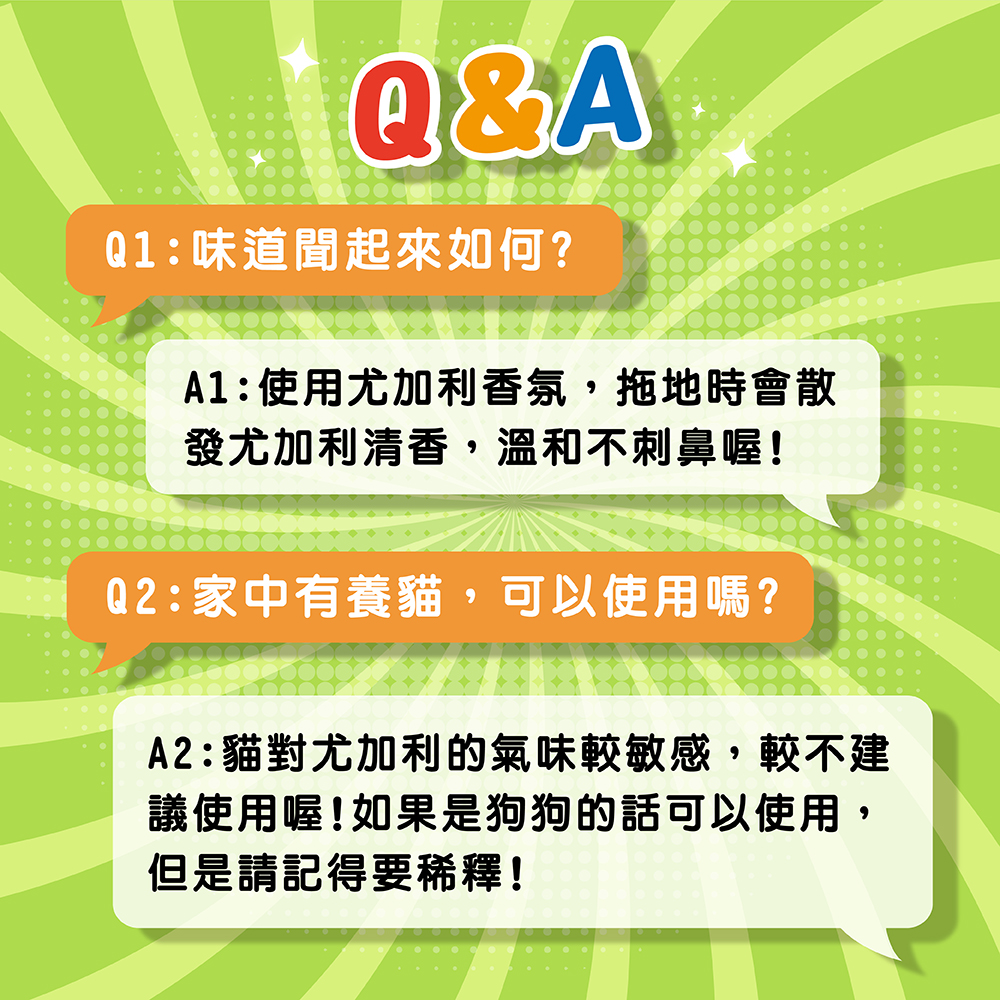 貓對尤加利的氣味較敏感,較不建議使用喔!如果是狗狗的話可以使用,但是請記得要稀釋。