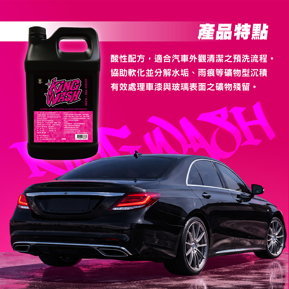 產品特點:酸性配方,適合汽車外觀清潔之預洗流程。協助軟化並分解水垢、雨痕等