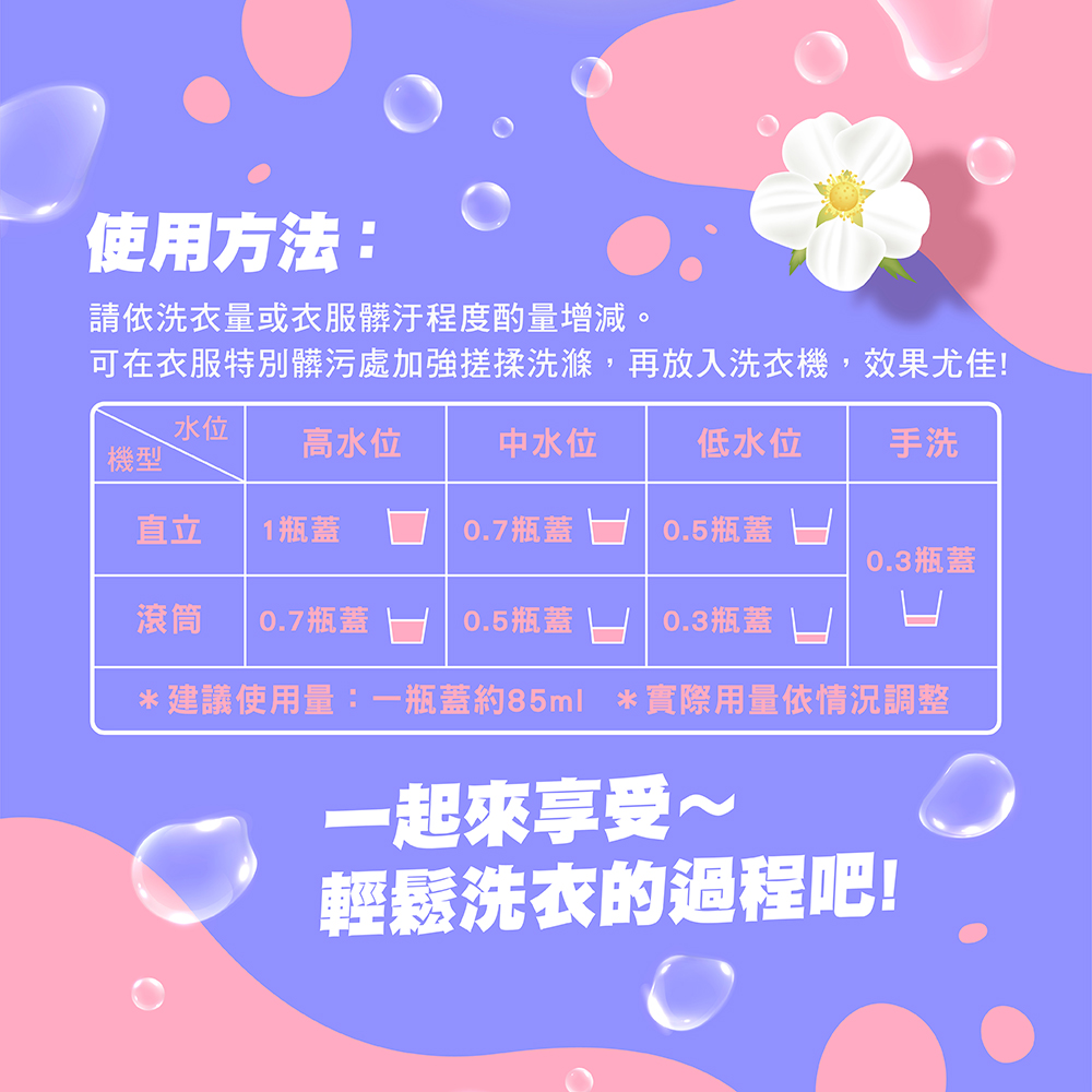 請依洗衣量或衣物髒污程度酌量增減;特別髒之處請直接倒於污垢稍加搓揉即能洗淨