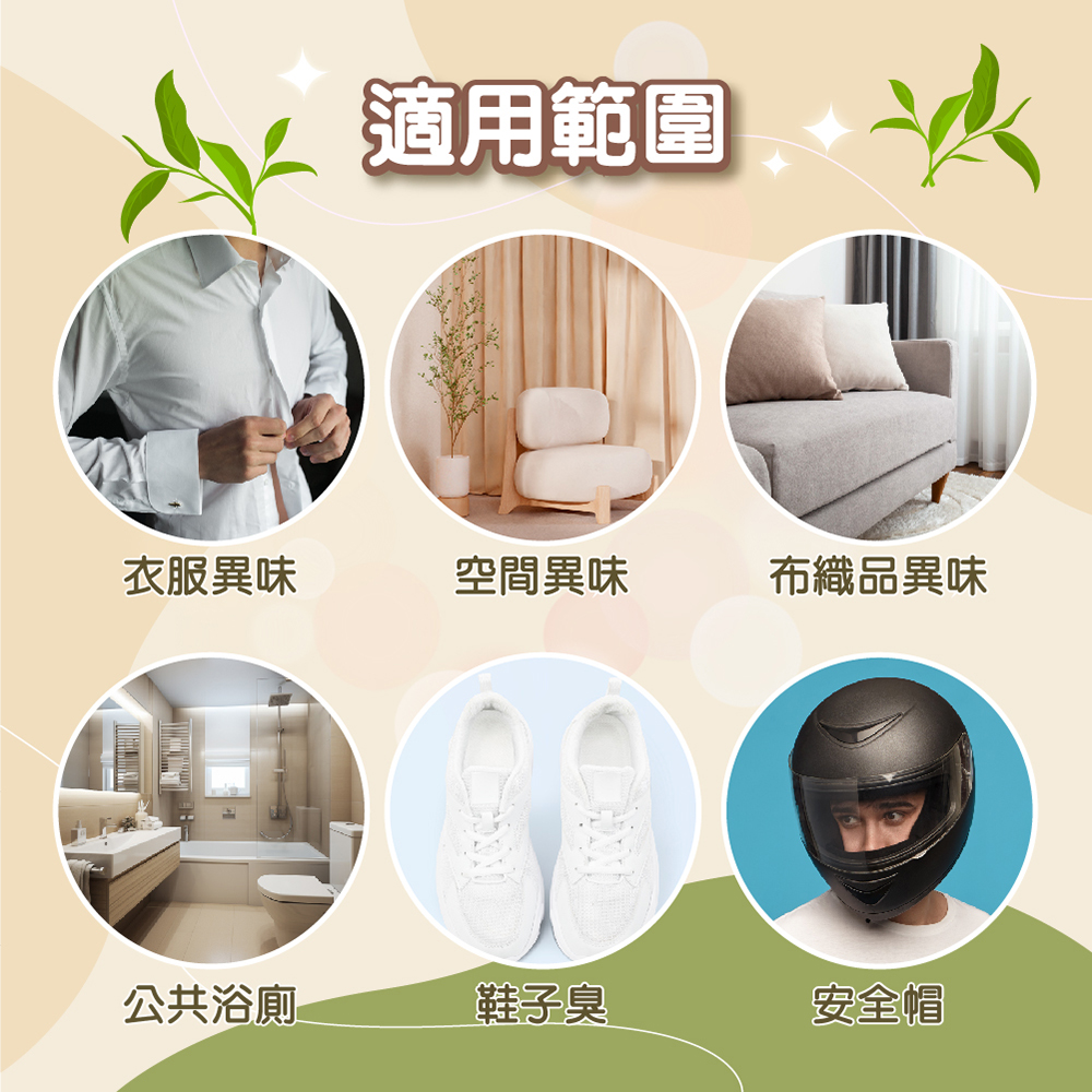 例:如廁後的悶臭、衣服異味、枕頭、沙發、窗簾等居家織品,