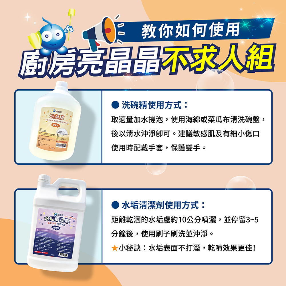 ● 金能洗水垢清潔劑 4kg: 專打白白霧霧的水痕、水垢、皂垢,預防生成,輕鬆刷洗水垢,省時省力!