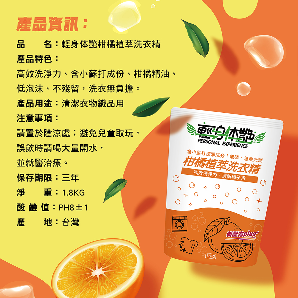 們隆重推出輕身体艷柑橘植萃洗衣精,讓您在洗衣時感受到自然的呵護與愉悅的香氛!